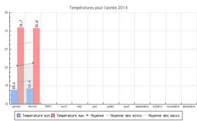 | fevrier | 18.4 °C | 20.3 °C | 31.6 °C | 28.6 °C | 24.0 °C | 2.7 km/h | 28.8 km/h | ESE |