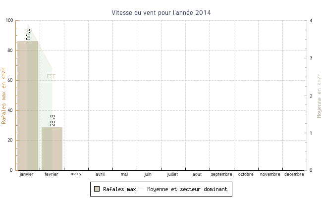 | janvier | 18.1 °C | 19.8 °C | 31.7 °C | 28.0 °C | 23.4 °C | 3.9 km/h | 86.0 km/h | E |